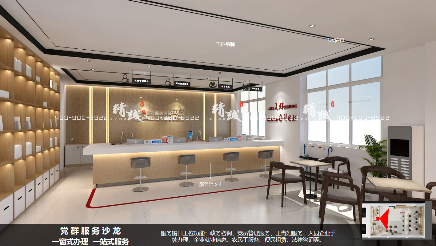 服務窗口工位功能:政務谘詢、黨員管理服務、工青婦服務、入園企業手續辦理、企業就業信息、農民工服務、便民租賃、法律谘詢等。