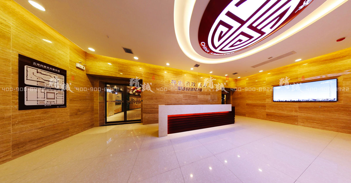 序廳吊頂采用中國檔案LOGO造型,牆麵采用石材裝飾,用折線燈帶裝飾。整體設計風格簡約大氣,視覺效果莊嚴、肅穆 。廳內設置導覽圖、接待處方便參觀者了解參觀動線,獲得更好從參觀體驗。