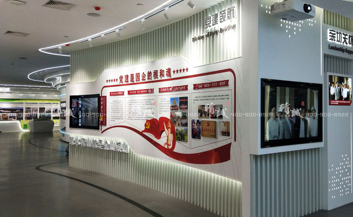 另一側的柵格造型牆展現了習大大對國企黨建“根”和“魂”的論述以及大地集團的黨建工作成果展示。